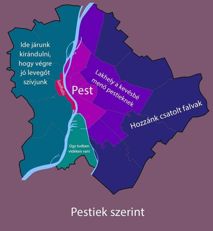 Szép „karriert fut be” az a bejegyzés a közösségi médiában, amelyik kevés szöveggel és könnyen befogadható, egyszerű ábrázolással mutatja meg – a hozzászólások alapján valóságot nem csupán nyomokban tartalmazó módon –, hogy Budapest különböző részeire hogyan tekintenek a budaiak, a pestiek, a vidékiek és a csepeliek.