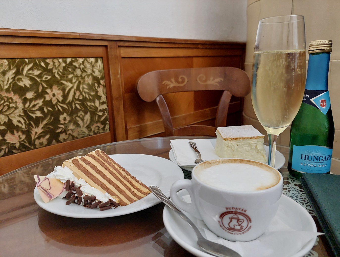 Egy jótanács azoknak, akik az időutazásnak is beillő belső vendégtérben szeretnének fogyasztani: ne álljanak be a sorba a süteményes vitrinekkel övezett pulthoz, hanem (szükség esetén előtte a szabad asztalt kivárva) foglaljanak helyet a belső helyiségben. Mi is így tettünk, és asztalszerviz mellett kértünk kávét, pezsgőt, Kastély karamell tortát, valamint az elmaradhatatlan Ruszwurm krémest.