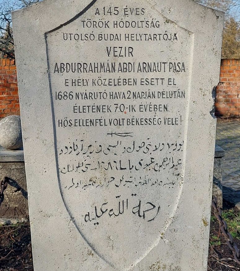 „A 145 éves török hódoltság utolsó budai helytartója vezir Abdurrahmán Abdi Arnaut pasa e hely közelében esett el 1686 nyárutó hava 2 napján délután életének 70-ik évében. Hős ellenfél volt békesség vele!”