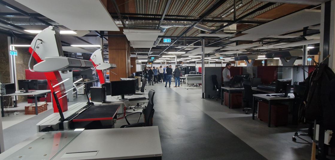 Az egy szinttel lejjebb 1200 négyzetméteres munkatérben 30 ember dolgozik egy műszakban. A felsőkamerás szkenner esetében egy üveglap súlyozza a könyvbölcsőbe helyezett példányok lapjait, amit kézzel kell lapozni. Monoton munka, nem való mindenkinek. Az OSZK saját képzési rendszerben oktatja őket, fél-1 év alatt.