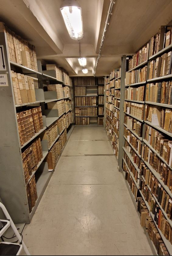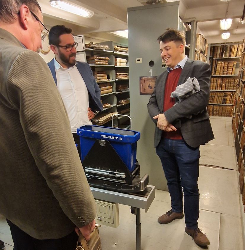 És hogyan jut el innen az olvasó által kért könyv az olvasóterembe? Teleliften érkezik a papír alapú kérvény, majd a raktáros (akikből egy műszakban egy dolgozik) ez alapján kikeresi az elolvasandó könyvet, majd teleliften felküldi. Nagyjából 40 perces folyamat, amíg az olvasó kézhez kapja a dokumentumot.