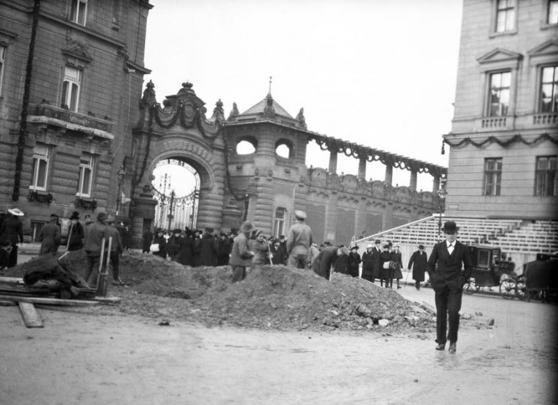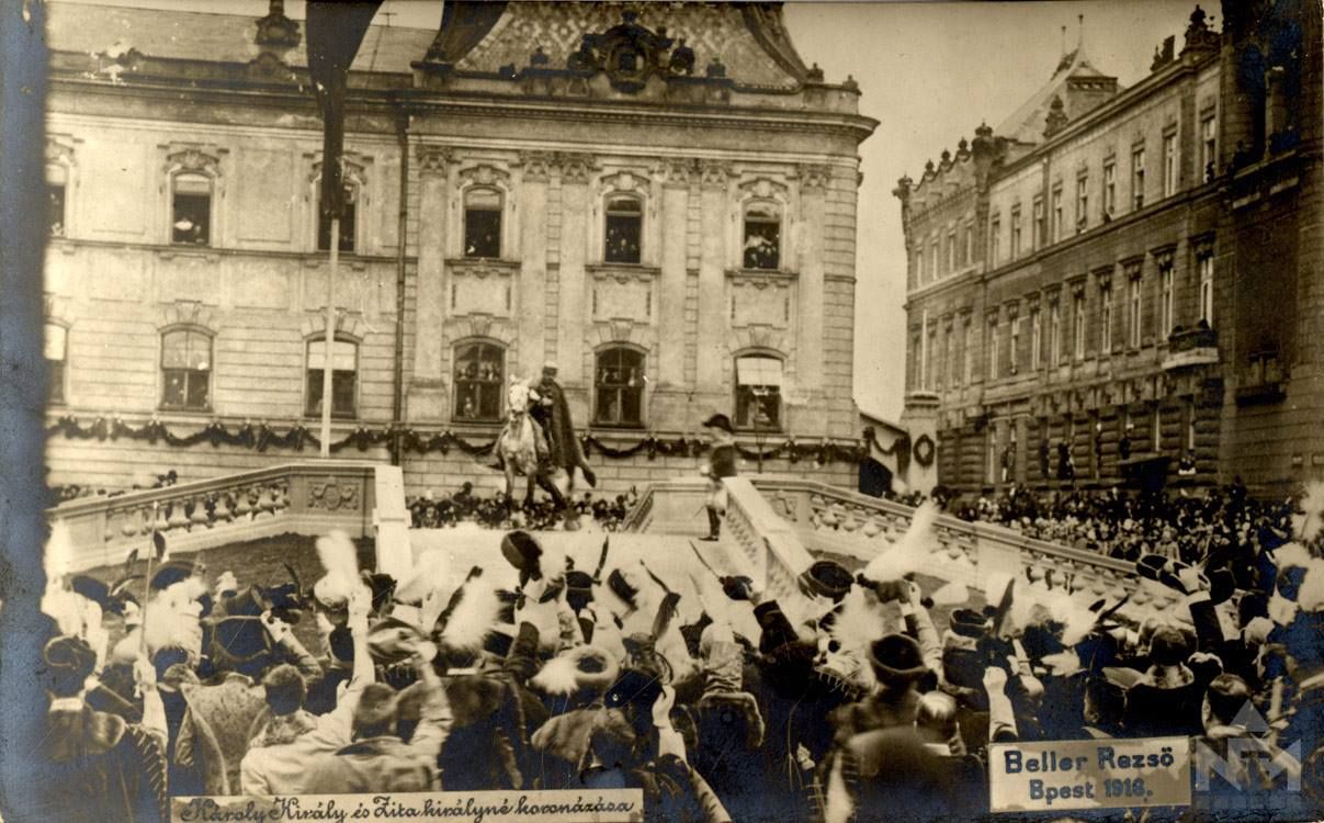 A királyi pár nyolcas fogaton érkezik a Koronázó főtemplom elé. A megkoronázott király a Szentháromság szobornál esküt tesz a magyar alkotmányra. Mellette Csernoch János hercegprímás és Tisza István gróf, a betöltetlen nádori tisztség teendőivel megbízott miniszterelnök. A koronázási menet indulását várók csoportjában nagybányai Horthy Miklós sorhajókapitány. A Szent György térre induló menetben lovagolnak: Frigyes főherceg, a Monarchia táborszernagya, balján fiával, Albrecht főherceg vadász-főhadnaggyal. A király előtt a hercegprímás és Tisza István. A Szent György téren a király az ország összes megyéinek földjéből emelt Koronázási Dombra vágtat és Szent István kardjával a világ négy tája felé sújt.