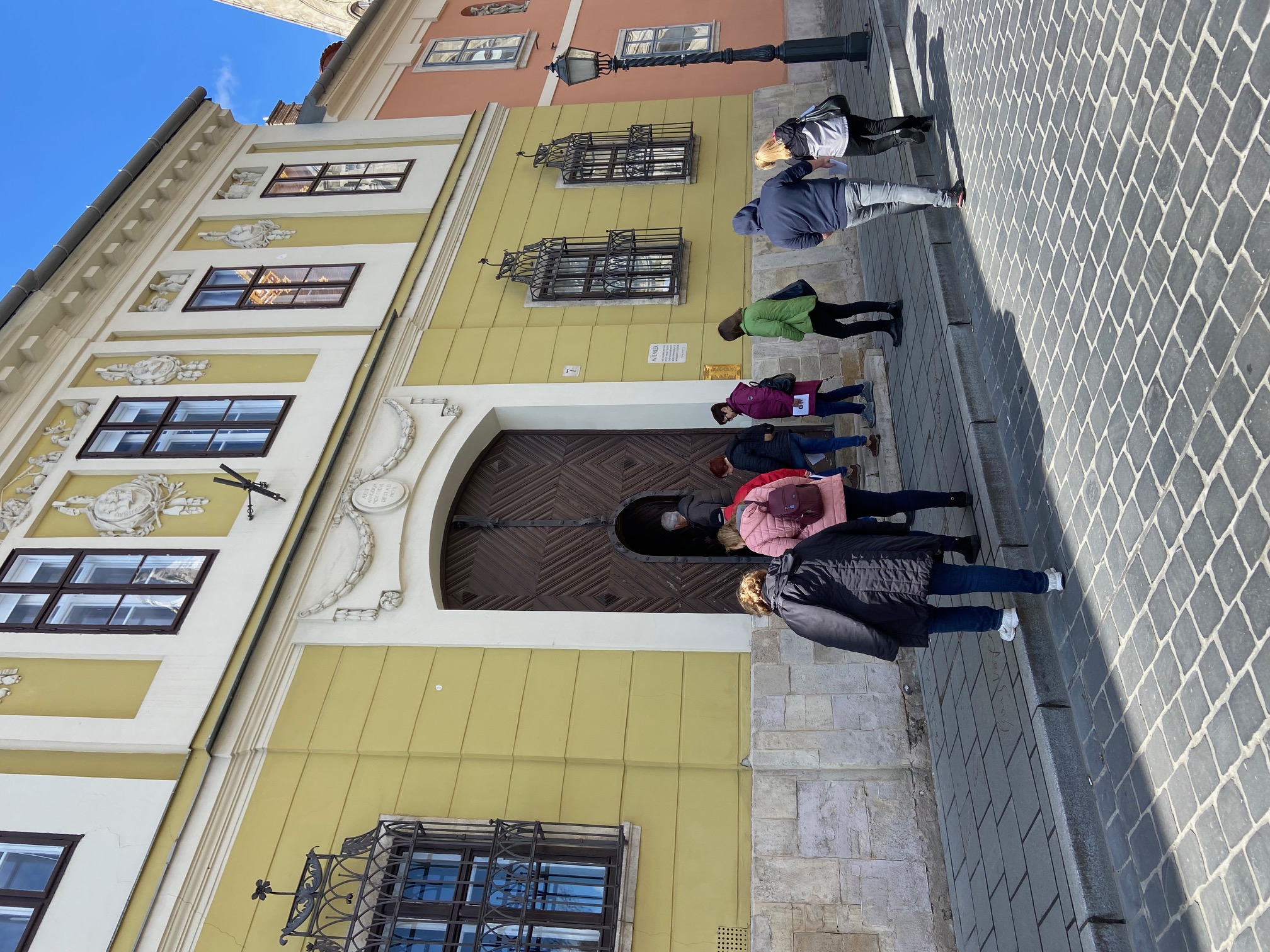 A séta első állomásán,a Bécsi kapu téren találkoztunk, ahol rögtön egy meglehetősen exkluzív antré következett: bejuthattunk az egykori mecénás, báró Hatvany Lajos (1880-1961) palotájának udvarába. Már a copf stílusú füzérdíszek is pazar látványt nyújtanak, de talán az sem véletlen, hogy a műkedvelő irodalmár Hatvany Lajos éppen egy olyan épületben élt, ahol a homlokzati domborműveken a művészetek és a tudományok allegóriái mellett Vergilus, Cicero, Szókratész, Livius, Quintilianus és Seneca képe is látható. A neobarokk kapun belépve annak az épületnek a falai közé léphettünk be, ahol Thomas Mann (1875-1955) több alkalommal is vendégeskedett, s itt találkozott Bartókkal is. Itt, ahol többek között Márai, Kosztolányi, Babits, Tóth Árpád, Ottlik Géza, sőt még Illyés Gyula is többször megfordult, hogy csak azokat az írókat, költőket említsük, akikről irodalmi sétánk kapcsán majd még szó lesz. Mert innen egyből – Tóth Árpád kőhajításra lévő budavári lakhelyét átugorva – a Tabánra és a Krisztinavárosra néző Tóth Árpád sétányra vonult át a csoport, ahol a hányatott sorsú költő viszontagságos életéről, feleségéről, lányáról, állandó nélkülözéseikről mesélt a sétavezető.